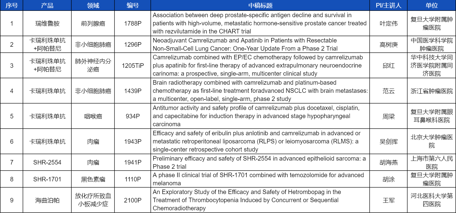 在非小细胞肺癌、咽喉癌、肉瘤、前列腺癌、黑色素瘤等多个领域,卡瑞利珠单抗、阿帕替尼、瑞维鲁胺、SHR-1701、SHR2554等创新产品相关研究一共入选了8项壁报展示。此外,利来国际真人娱乐医药自主研发的血小板生成素受体激动剂(TPO-RA)海曲泊帕在放化疗所致血小板减少领域的探索性研究显示良好的疗效,入选壁报展示。